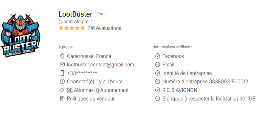 Je mets un point d'honneur à la relation client, au suivi de vos commandes et à la qualité des produits que je vends, en vous proposant ma sélection de coups de cœurs sur une multitude d'objets variés et collectors. Des figurines à monter soi-même, des jeux de cartes à collectionner, de la littérature ou encore du prêt à porter issu de vos licences favorites, je ne doute pas que vous trouverez votre bonheur ou celui de vos proches dans ma boutique !
